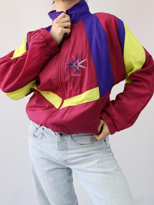 Vintage 80s 90s tracksuit jacket, stand-up collar, velvet, purple, black, blue, L