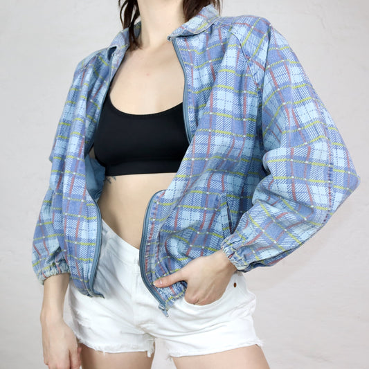Vintage 80s 90s denim jacket bomber jacket checked denim yellow red blue 38
