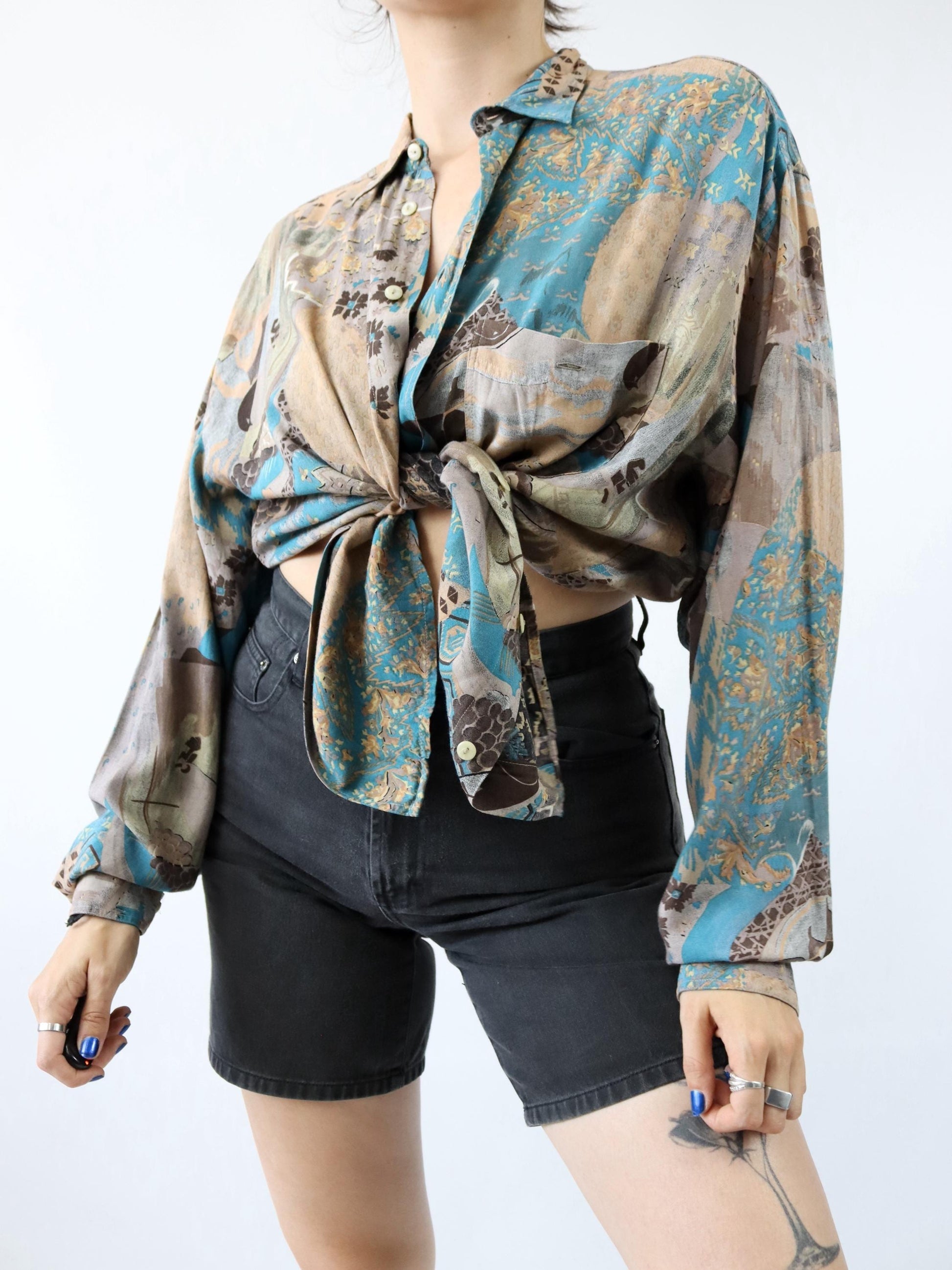 Vintage 80s 90s BALLOON blouse shirt long sleeve crazy pattern L