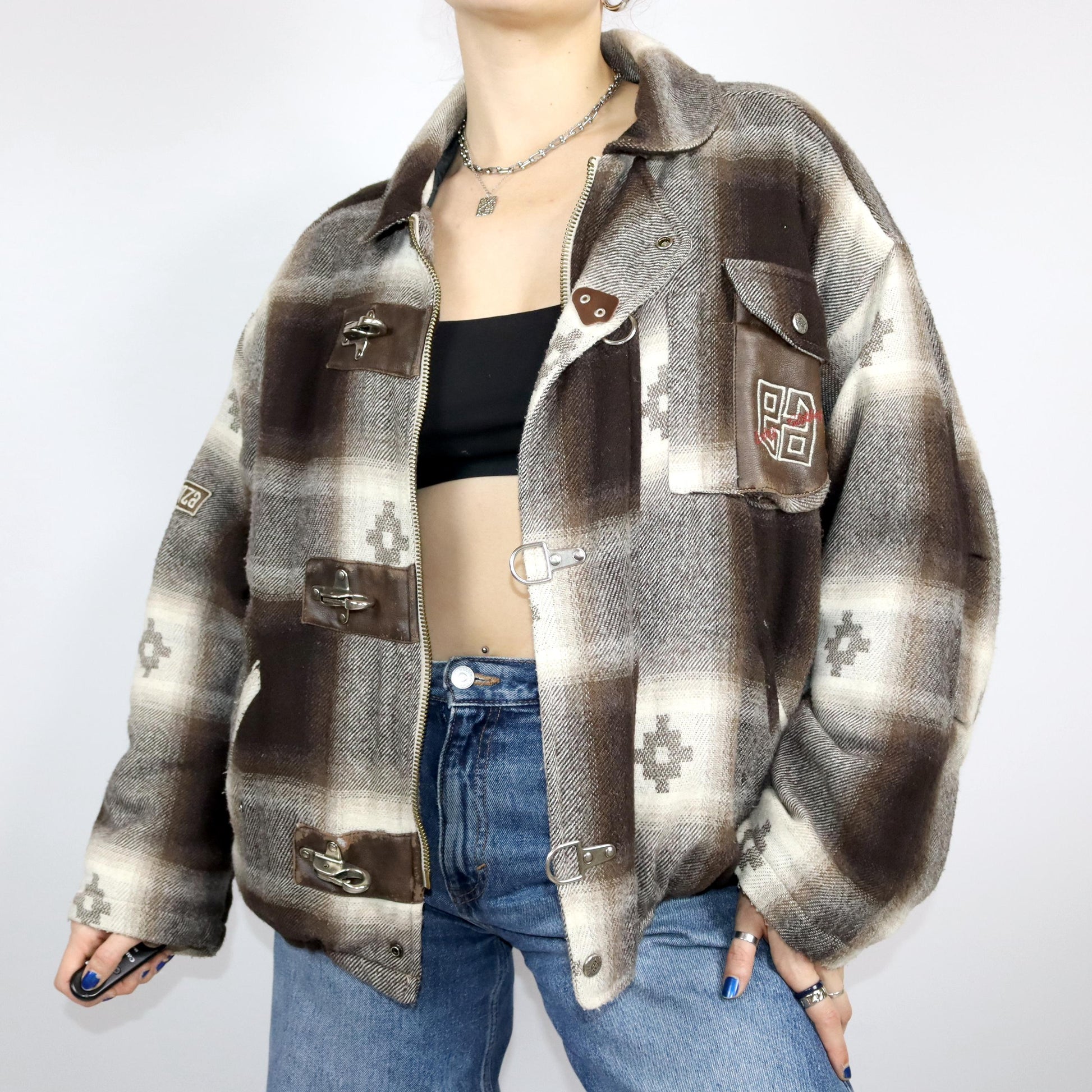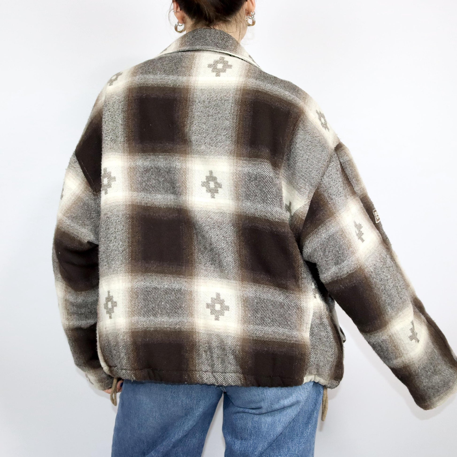 Vintage 80s 90s ESSENZA winter jacket lightly lined patterned beige brown wool M