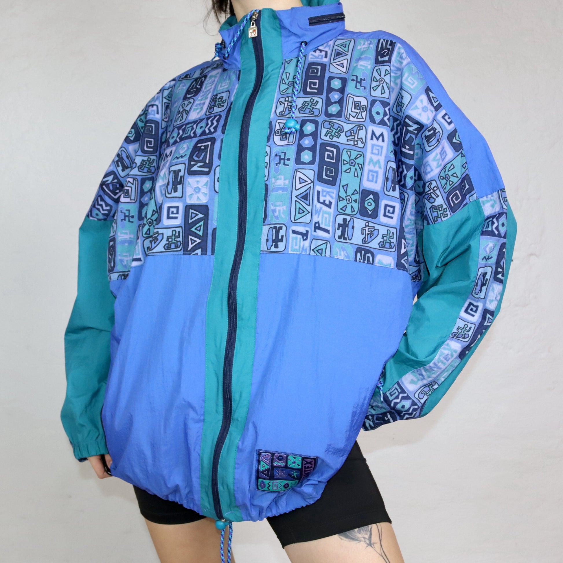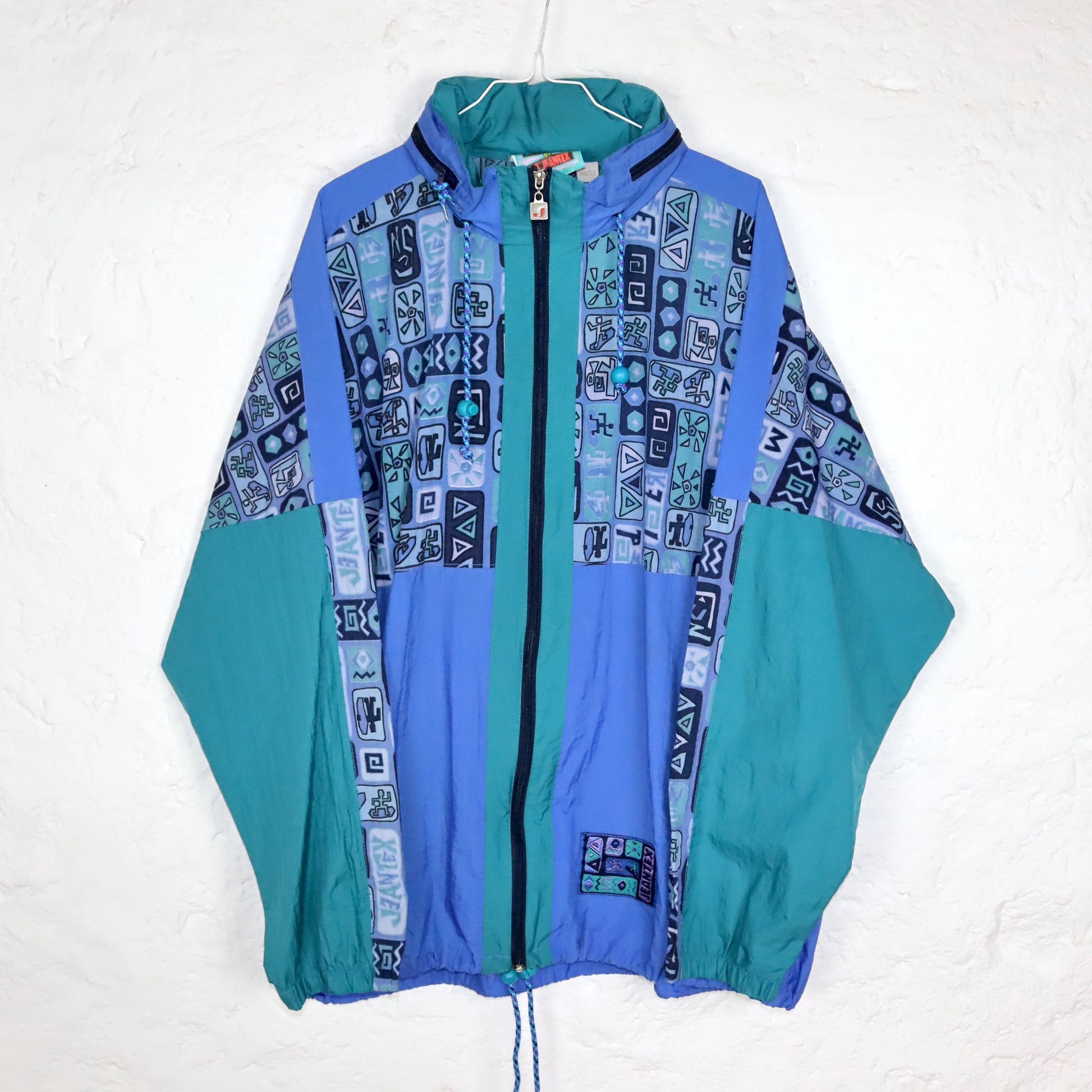 Vintage 80s 90s JEANTEX rain jacket windbreaker crazy pattern blue green 50/52 L
