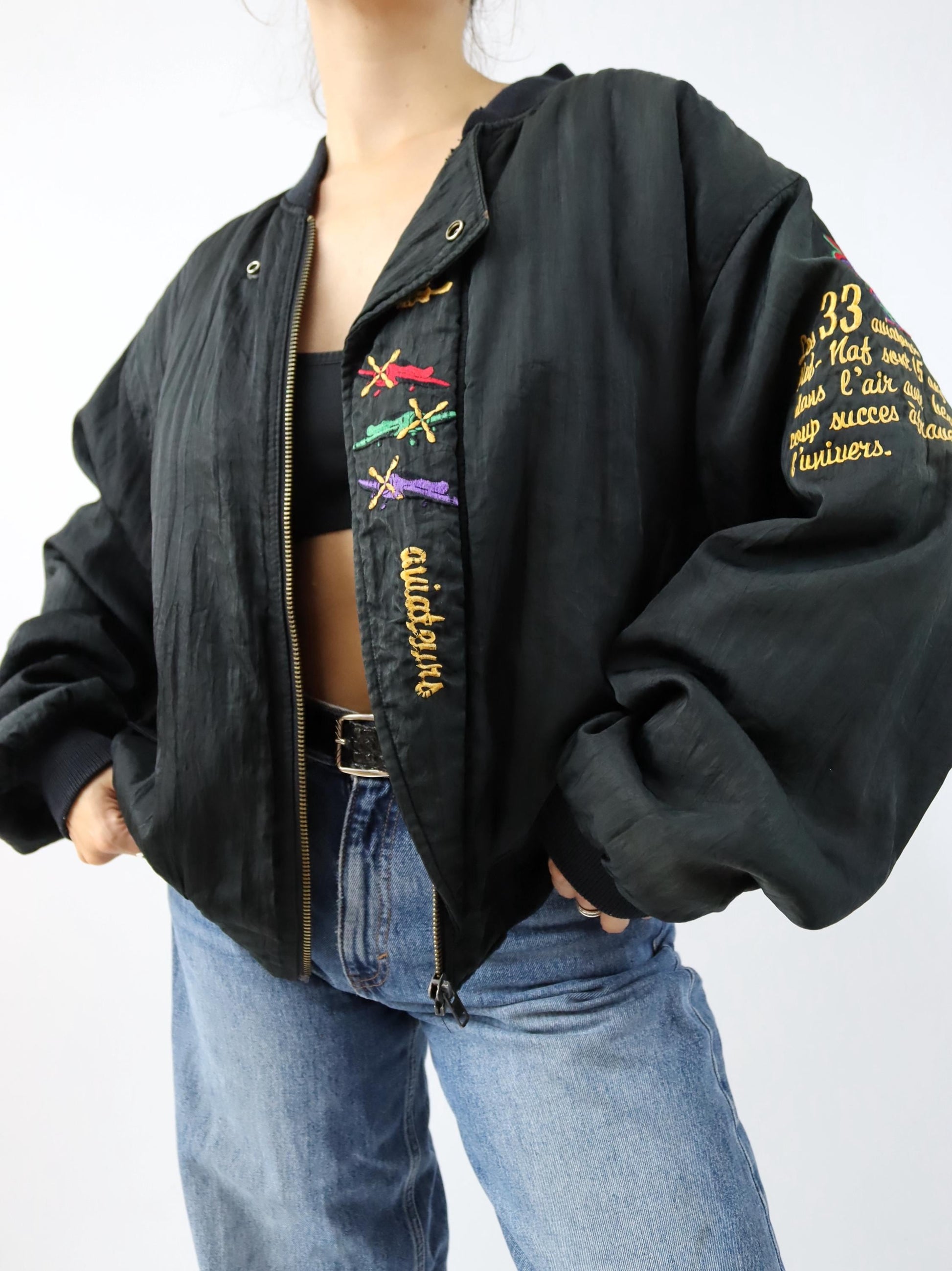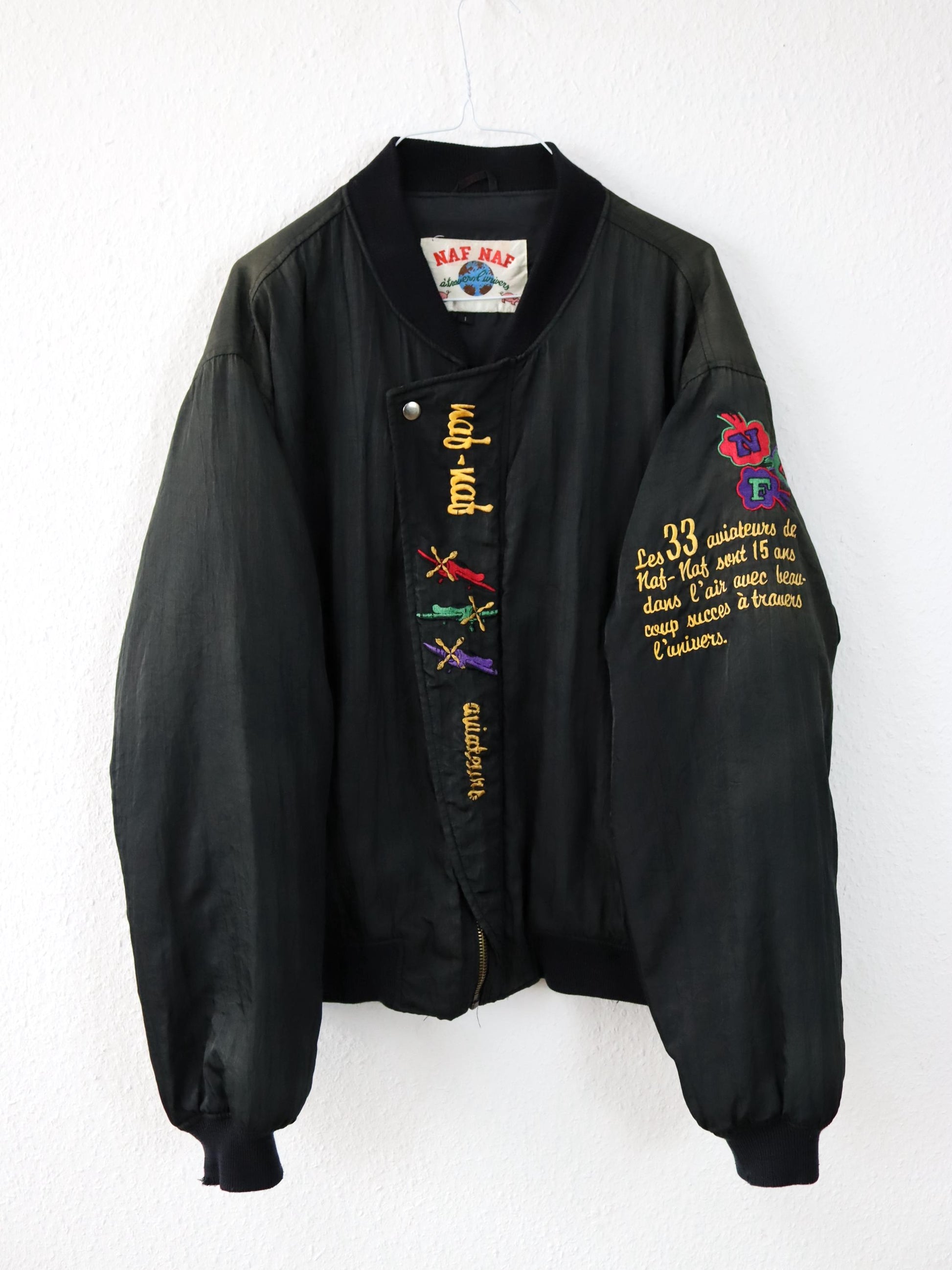 Vintage 80s 90s NAF NAF Blouson Bomber Jacket Embroidery Lightly Lined Black L