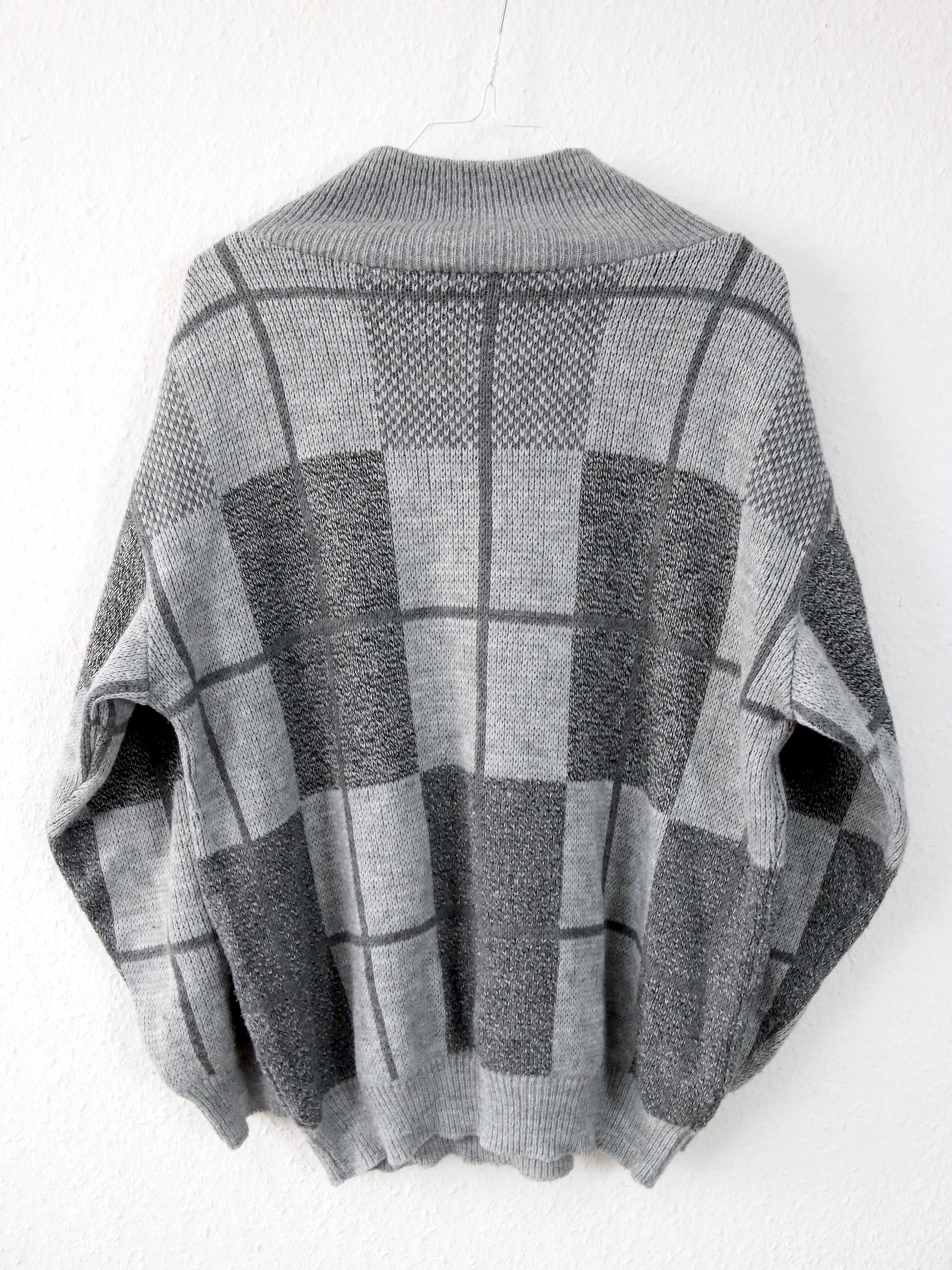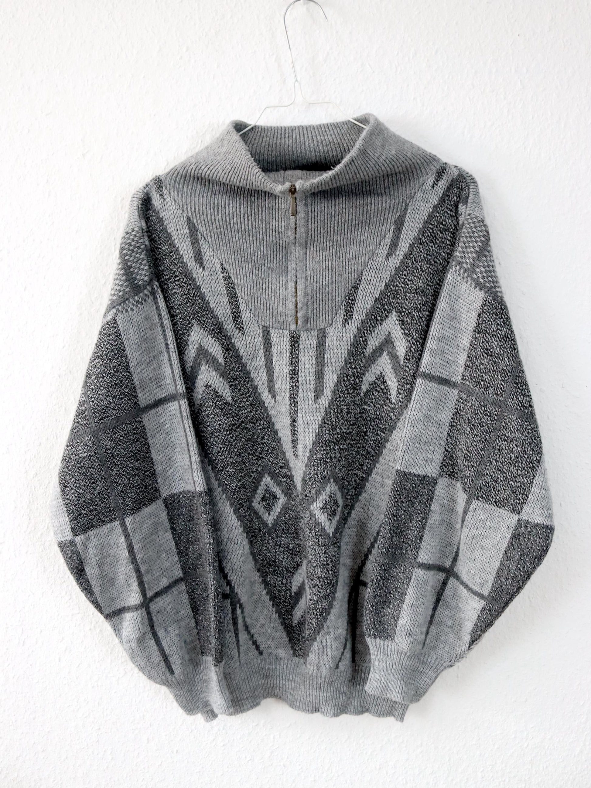 Vintage 80s 90s knitted sweater patterned zipper grey S/M