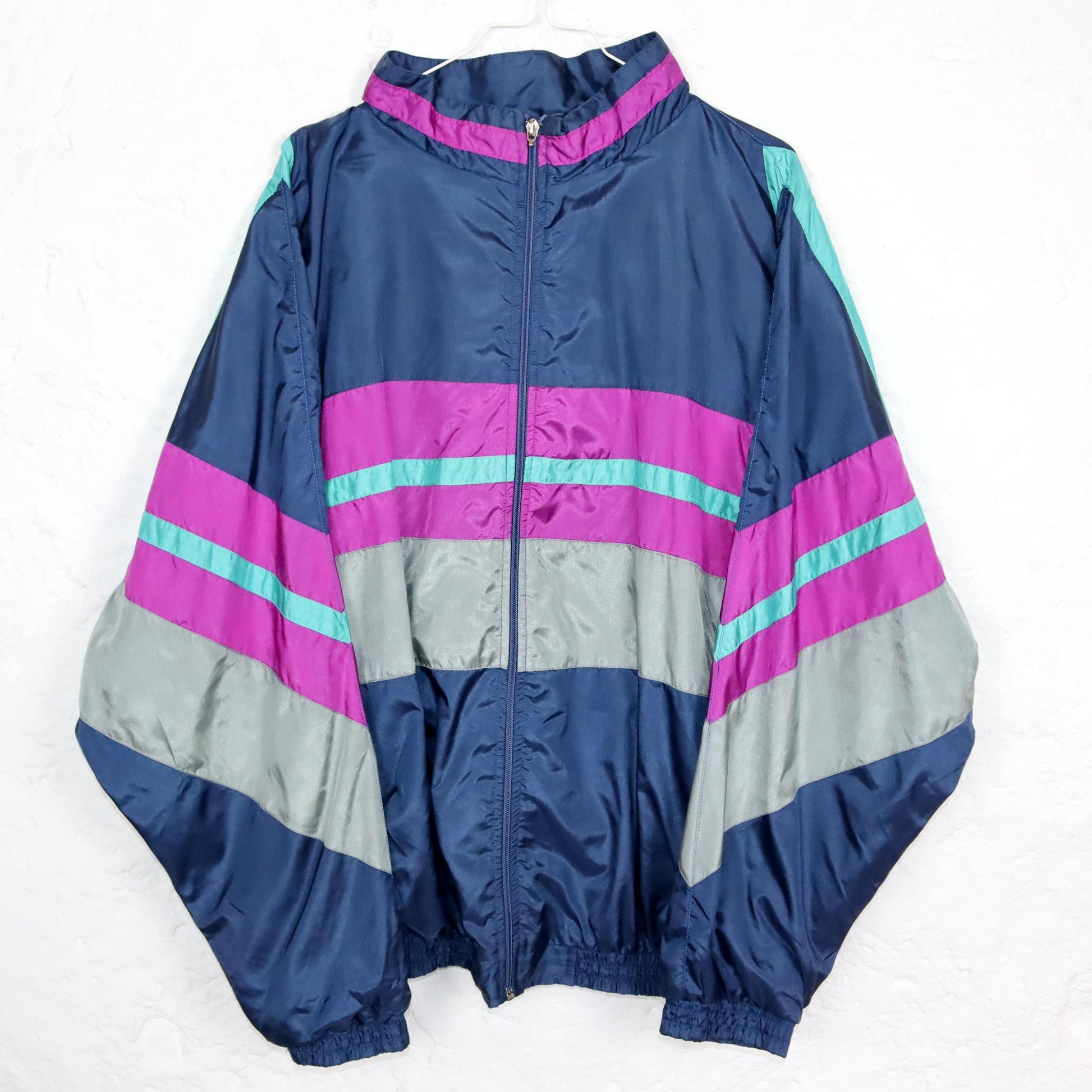 Vintage 80s 90s tracksuit jacket sports jacket stand-up collar shiny double-layered purple turquoise dark blue L/XL