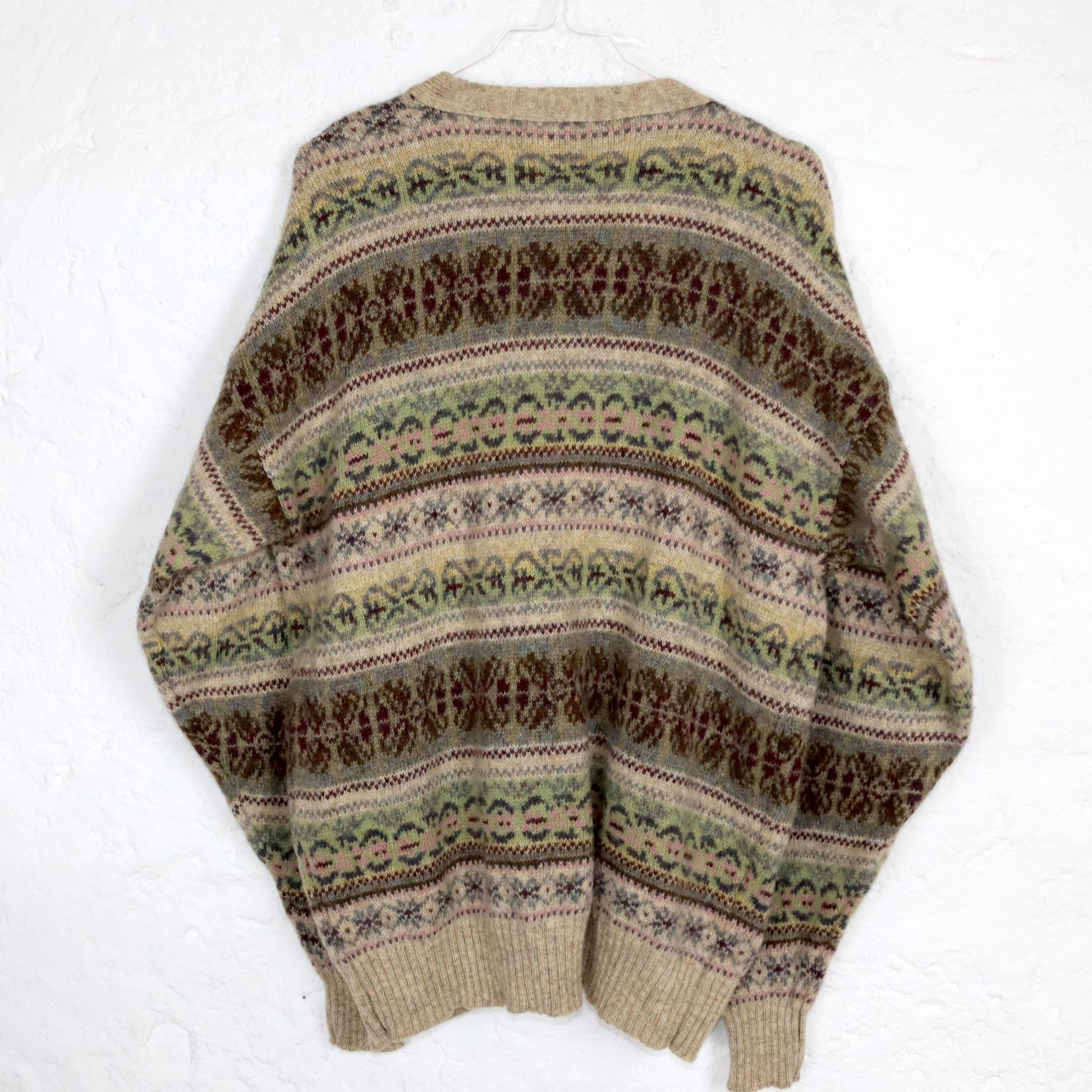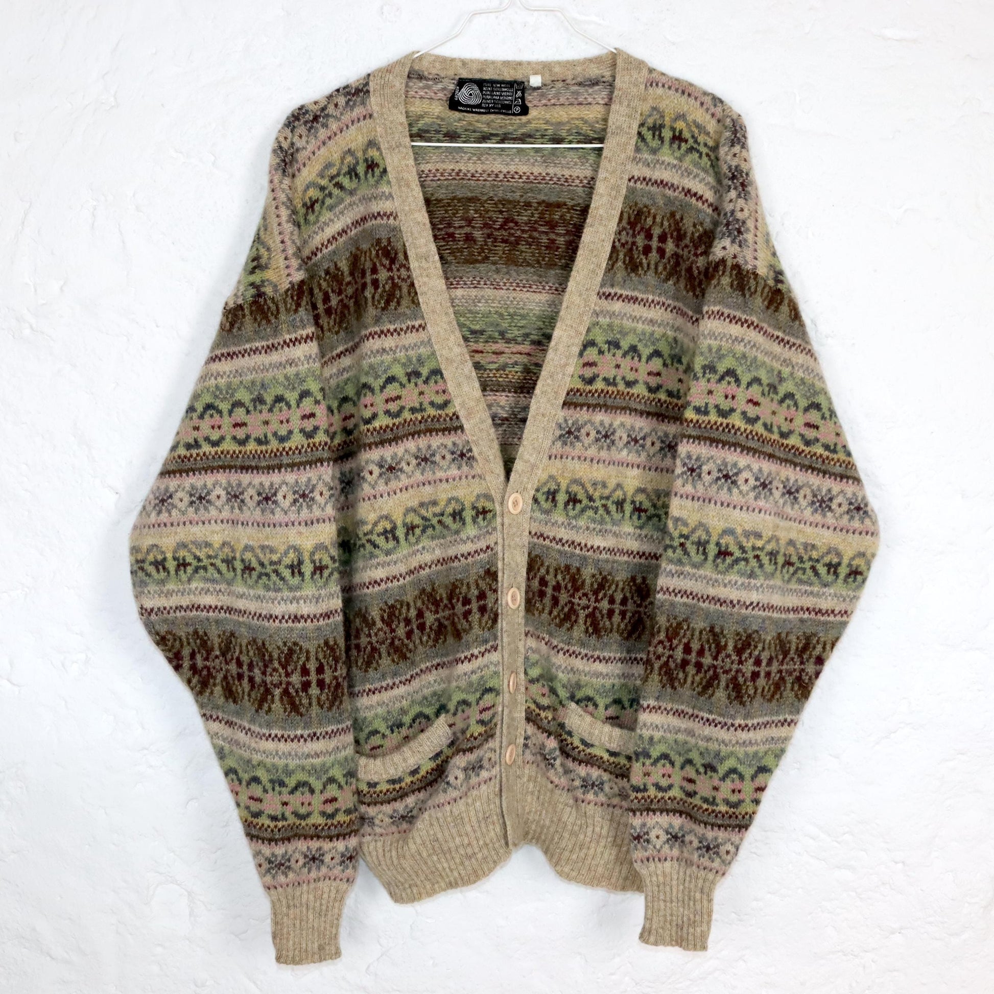 Vintage 80s 90s wool cardigan, patterned beige, colorful, pastel, L