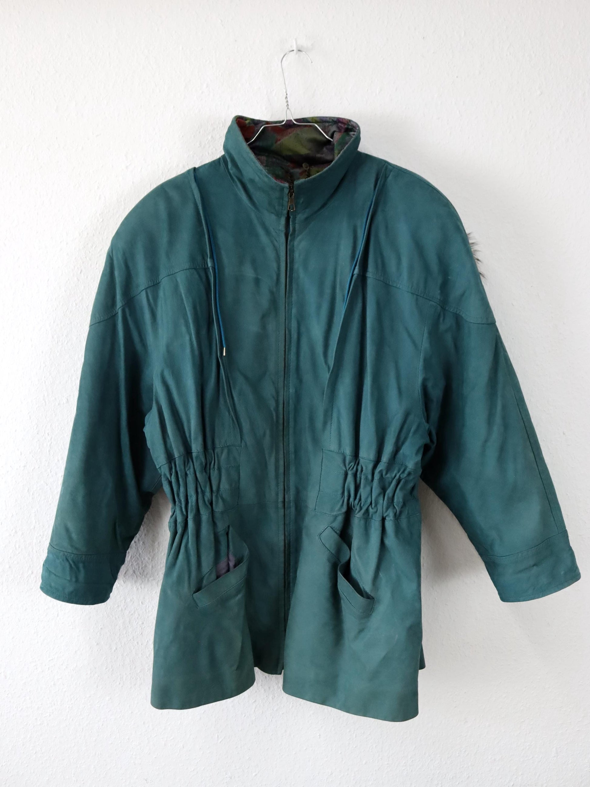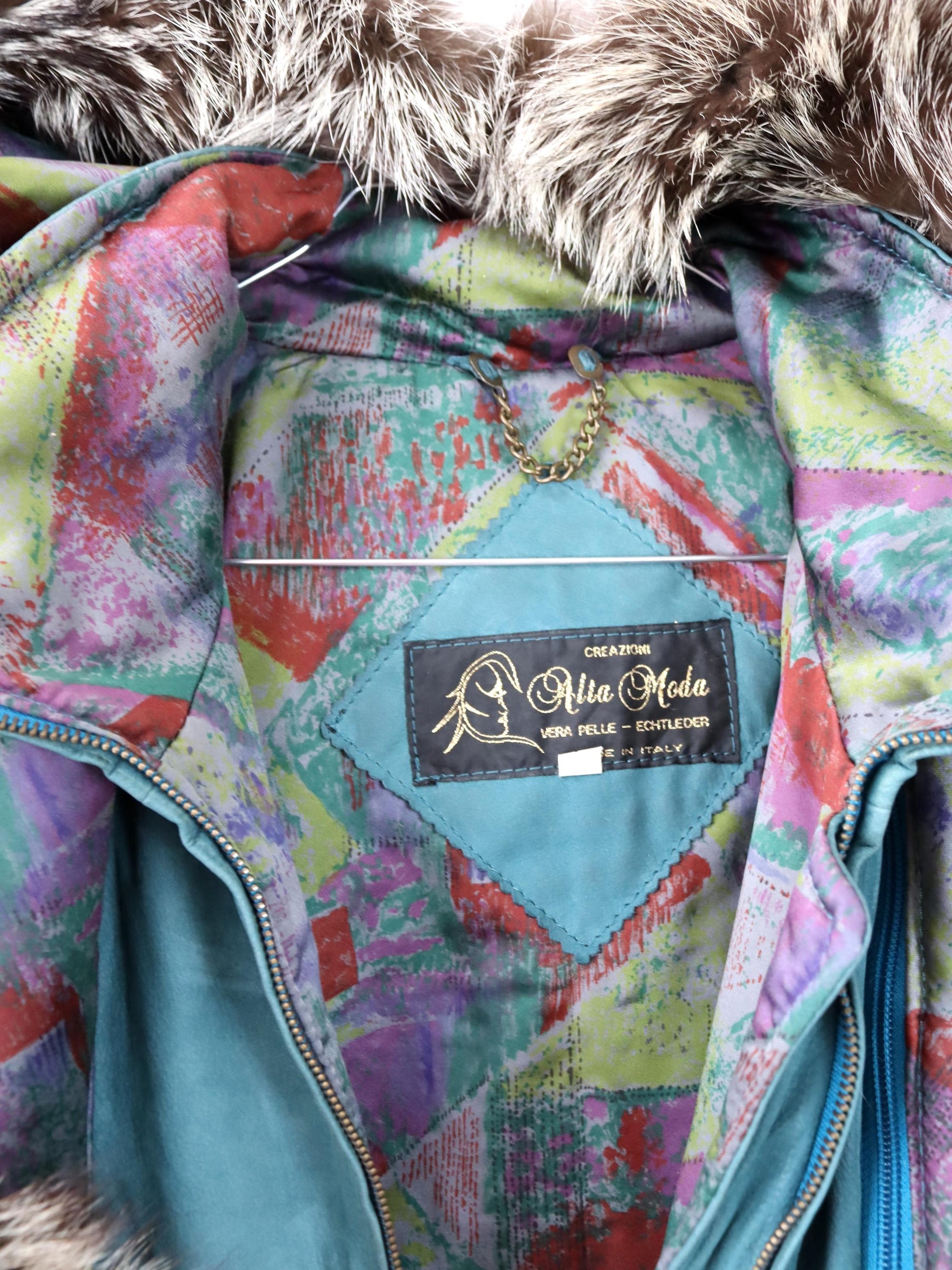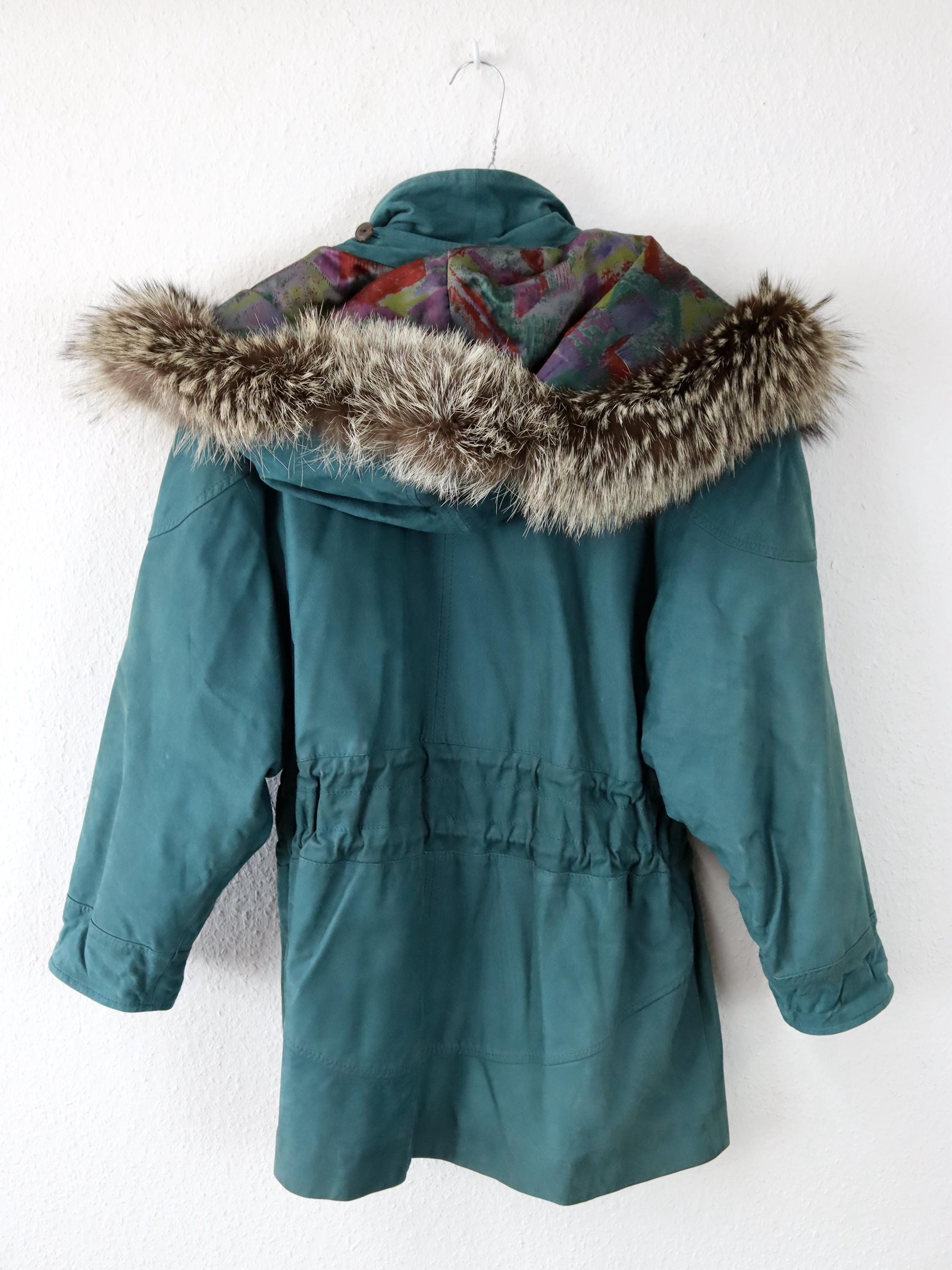Vintage 80er 90er ALTA MODA Ledermantel Lederjacke Kapuze Pelzkragen türkis 42
