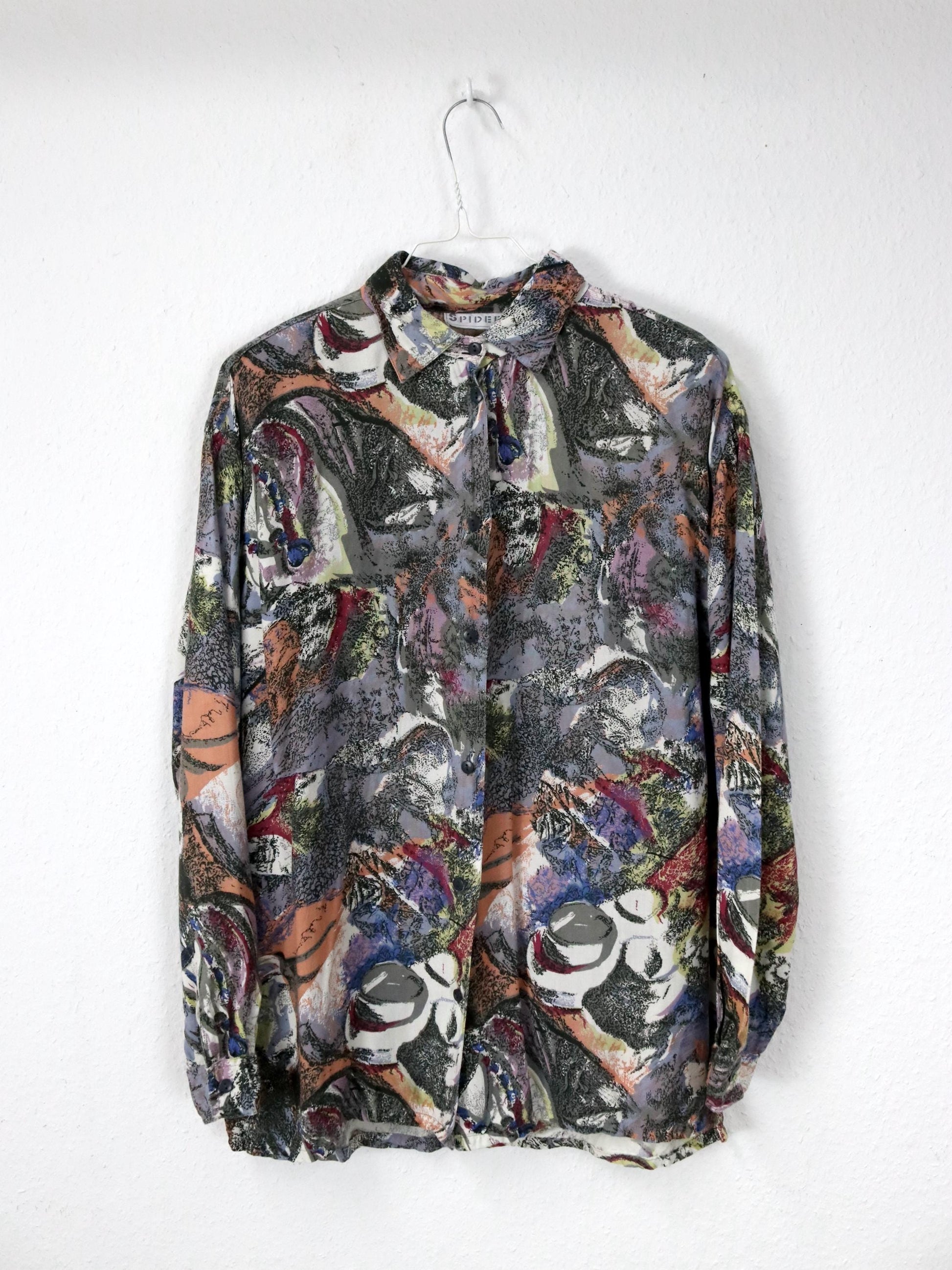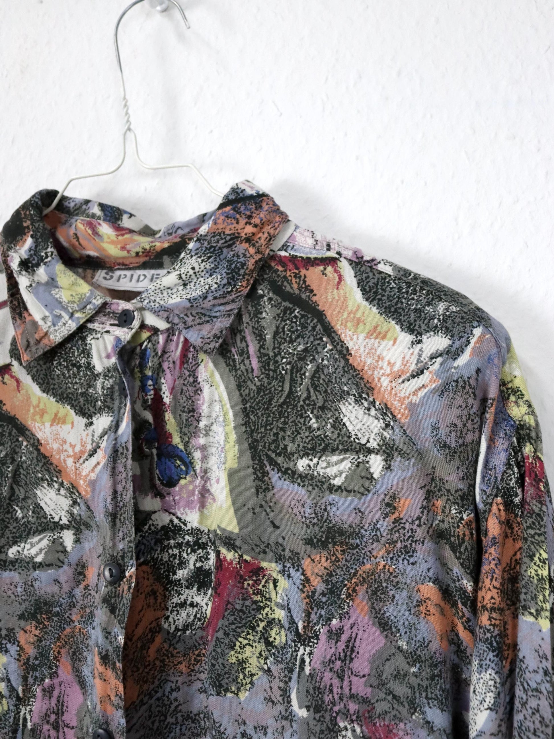 Vintage 80er 90er SPIDER Bluse Langarm Crazy Pattern grau schwarz orange blau lila rot gelb Schulterpolster L